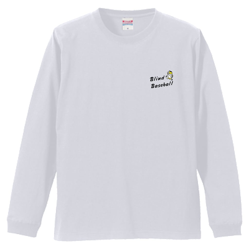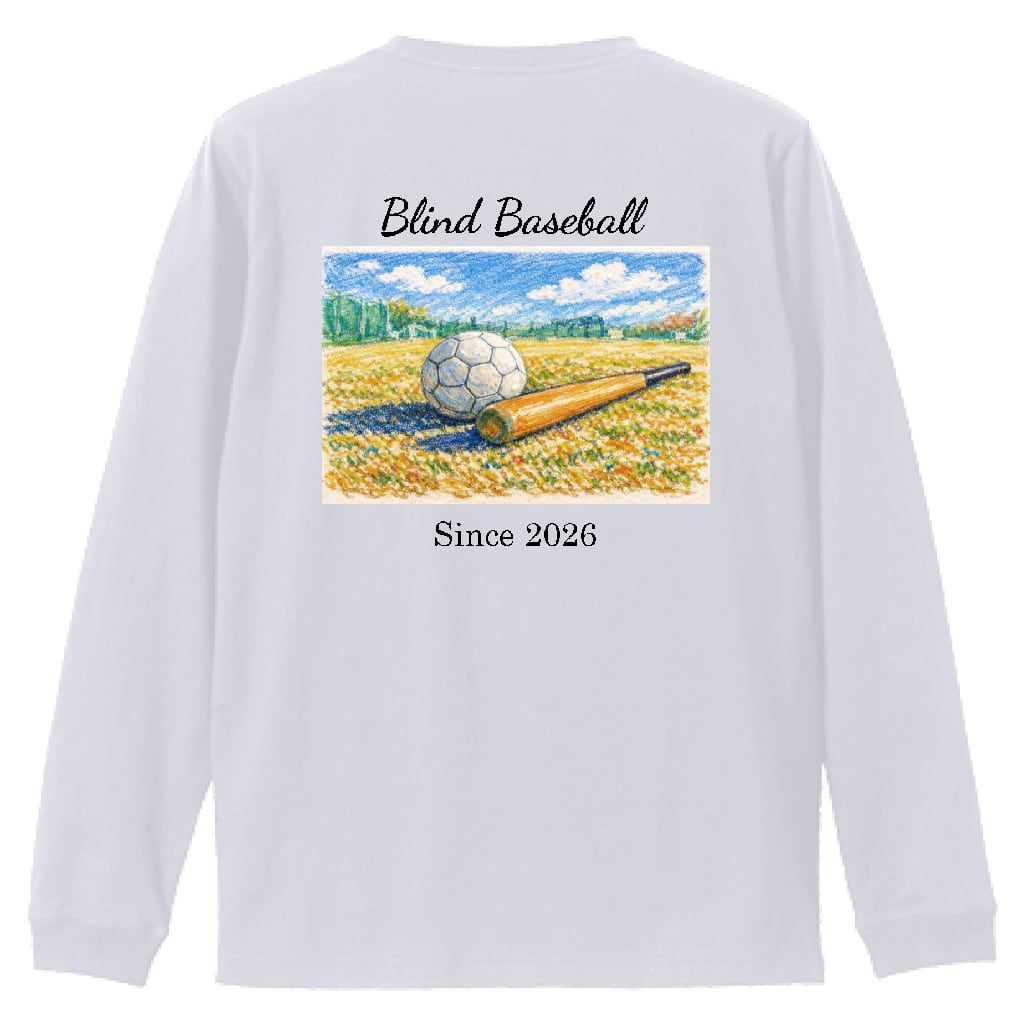 背面に青空の下、ボールとバットがグラウンドにある絵をあしらったアートロングTシャツです